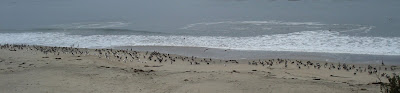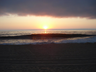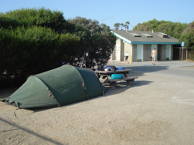 Den ersten Campground am Beach erreichten wir schon am Nachmittag. Schon etwas Besonderes, das Zelt in kaum 100 m Entfernung vom Wasser aufzustellen. Das wir uns kurz danach schon in den warmen Sand legten, ist klar. Die Wassergeräusche und die warmen Temperaturen liessen uns dösen und kurz darauf sogar einschlafen. Nach dem Nachtessen setzten wir uns wie alle hier an den Strand, um die Lichtveränderungen bei der untergehenden Sonne zu betrachten. Eigenartig war dabei auch das Wolkenphänomen: Der ganzen Küstenlinie entlang zog sich eine grauschwarze Wolkenschärpe, die einige 100 m vor der Küste begann und vielleicht 1 km landeinwärts aufhörte. - Etwa 200 m über Grund. Bei uns hätte das Regen bedeutet, hier überhaupt nicht. (In Stanford sagte uns Florian B., da habe es seit März nicht mehr geregnet.) Während die Sonne im klaren Licht des offenen Horizonts unterging, befanden wir uns am Ufer unter einem Deckel. Entsprechend war es kurz nach 20 Uhr bereits dunkel.