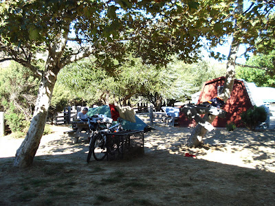 - Dort gab's dann aber keine Hiker Biker Site (das ist sonst nur auf privaten Campgrounds so), dafür einen steinharten Sandplatz. Das zwang uns zum Improvisieren, denn wir mussten das Zelt mit Schnüren aufspannen (siehe auch das Bild danach).