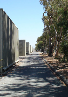 Die Elektronen und Positronen werden im Untergrund unter dem Blechkasten hindurch geschossen. Alles ist abgeschirmt mit dicken Betonklötzen. Einige davon, inzwischen nicht mehr gebraucht, stehen nun auf dem Gelände neben dem Beschleuniger,wo sie gelagert werden, bis sie nicht mehr radioaktiv strahlen.