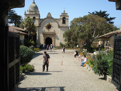 Als Kontrast zum eben Beschriebenen, kann man weniger als eine halbe Meile von Carmel in Richtung Süden eine Mission mit einem wunderbaren Kreuzgang anschauen. Die Mission San Carlos Borromeo del Rio Carmelo gehört zur Siedliungsgeschichte Kaliforniens. Der Pater Junipero Serra gründete sie in den 1770er-Jahren um die Indianer zu bekehren. (Es sollen zwar 4000 Indianer konvertiert haben, aber noch viel mehr an den eingeschleppten Krankheiten gestorben sein.)
