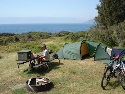 Ein weiterer Radfahrer verbrachte zweimal hintereinander die Nacht ebenfalls in unserer Nähe. In Monterey nahmen wir noch nicht besonders Notiz von ihm. Es fiel uns lediglich auf, dass er kaum Gepäck dabei hatte und während des Zeltaufbauens laut redete. Dass er kein Handygespräch führte, wurde am Sonntag Abend klar. Er suchte Feuerholz - was nicht erlaubt ist; Campfires sind überall nur mit gekauftem oder mitgebrachtem Firewood gestattet -, machte eine hochloderndes, schnellabbrennendes Feuer - und redete ständig, ja, er deklamierte in grosser Lautstärke eine Art Schimpfrede. Jedes dritte seiner Wörter war "fuck" oder "fucking". Das ging so endlos, begann aber erst zu nerven, als er seine Rede in der Dunkelheit im Zelt fortsetzte. Um Mitternacht herum dann Lärm von knackendem Holz. Waren da erneut Waschbären am Lebensmittelkasten? Nichts wie raus, denn hier konnten wir während zwei Tagen nur beschränkt (und überteuert) einkaufen, durften uns also auf keinen Fall das Essen stehlen lassen. Aber es waren keine Waschbären. Der Mann war erneut am Feuermachen und heftigem Reden. Mir, G., reichte es. Ich rief im zu, was er da eigentlich tue. Nach einem Moment der Ruhe tönte eine Stimme herüber: "I am camping." Auf die Rückfrage, warum er das so laut tue, folgten unartikulierte Laute und böses Gemurmel. Dann herrschte immerhin eine halbe Stunde Ruhe. Beim Frühstücken war dann wirklich Stille. Die Erschöpfung nach der langen Rede schien ihm nun doch Schlaf geschenkt zu haben. (Am Dienstag begegneten wir ihm übrigens erneut, diesmal unterwegs. 400 m vor uns hörten wir ihn bereits deklamieren, stehend, mitten auf der Strasse. Als wir an ihm vorbeifuhren und ihn grüssten, nickte er nur stumm.)