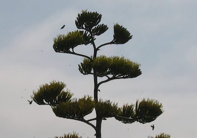 Da kam dann bis zum Eindunklen eine ziemlich grosse Wohngemeinschaft zusammen, etwa ein Duzend Leute. Während wir bei der Abendlektüre sassen, räkelte sich einzelne mit ihren Laptops in den Polstern, und in der Küche fand eine lebhafte Diskussion über Hochdeutsch und Schweizerdeutsch statt. Deutsche und Schweizer unterhielten sich über Besonderheiten er deutschen Grammatik und der Qualitäten unserer Mundart. (Wir hatten uns zuvor mit der Luzernerin und dem Tessiner unterhalten und u.a. erfahren, dass sie im Rahmen des 175-Jahre Jubiläum der Uni Zürich hier an der Westküste einen Besuch machen, um die Vorbereitungen der Präsidentenwahlen zu beobachten. - Ins Gespräch über die Sprache schaltete sich G. nicht ein; er wollte dem spontanen Austausch nicht mit fachlichen Kommentaren die Würze nehmen.)